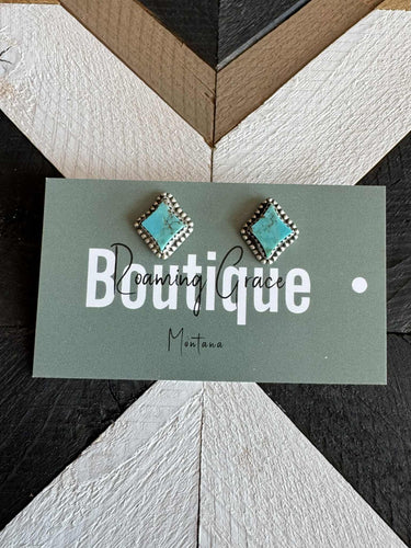Handmade Sterling Silver Kingman Turquoise Diamond Post Studs with Signed