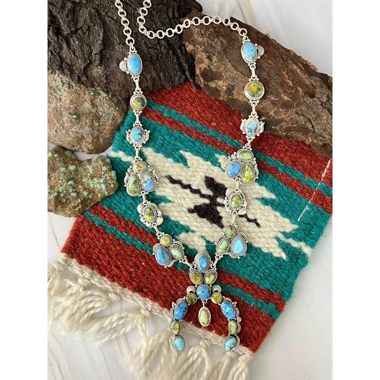 Product Description: * Category: Necklace * Main Stone: Palomino with Golden Hills Turquoise * Metal Purity: 925 Sterling Silver * Handmade: Yes * Brand: Nizhoni Traders LLC * Each Listing is for 1 Necklace Such gorgeous craftsmanship! Sterling Silver Palomino with Golden Hills Turquoise Necklace Measures Length 17+6" Extension, Width 2" with an additional drop of 2 4/8" Actual colors may vary slightly due to lighting, screen display and/or the way color is seen by an individual.