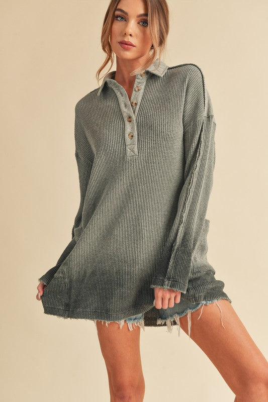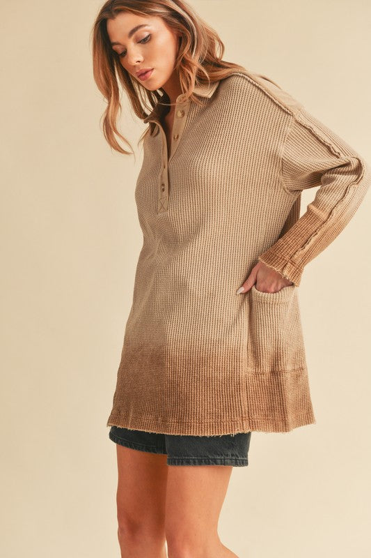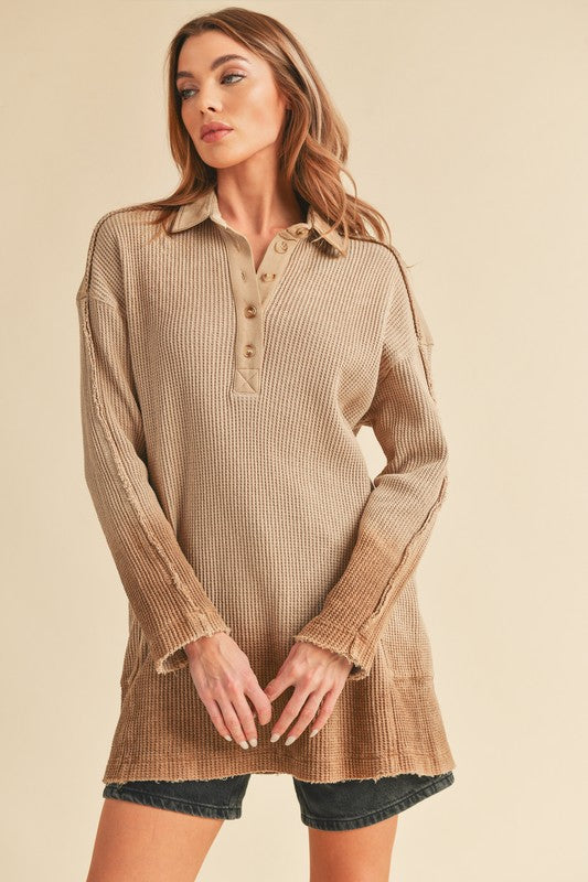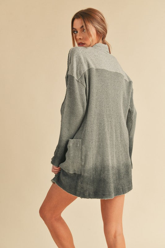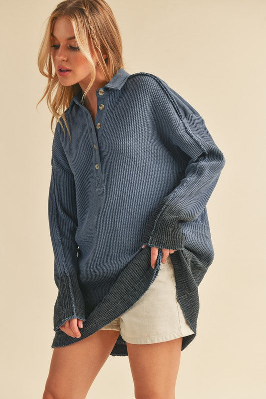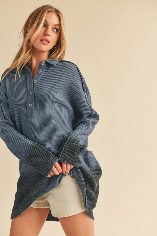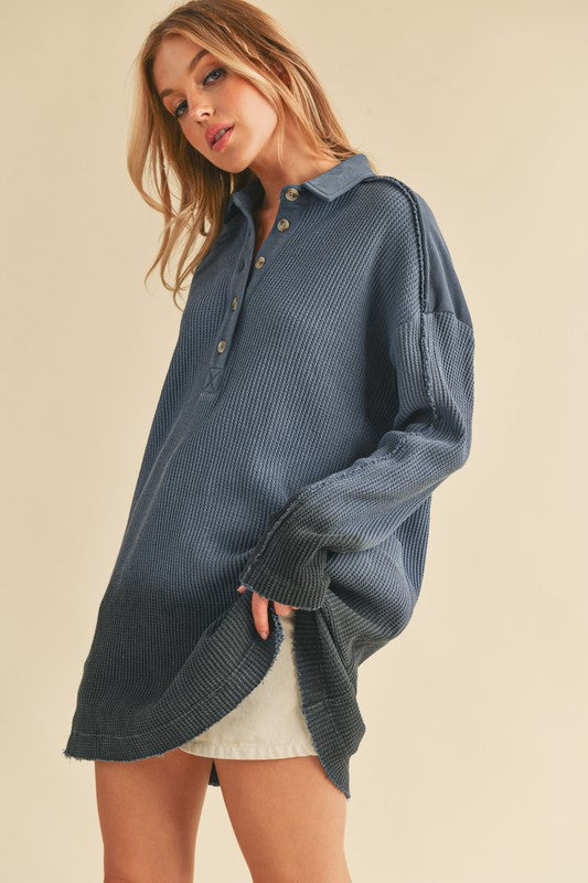 Unleash effortless edge with our so cool Capri thermal top. Embrace the oversized, slouchy fit and staple waffle knit fabric with contrast piecing at the back and ombre detail at the bottom, adding a dynamic touch to your outfit. The slouchy, longline fit complements the button-front neckline, dropped shoulders, classic collar, defined seaming, and side pockets. Elevate your style with this statement piece, designed to redefine casual chic.