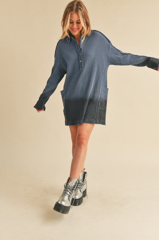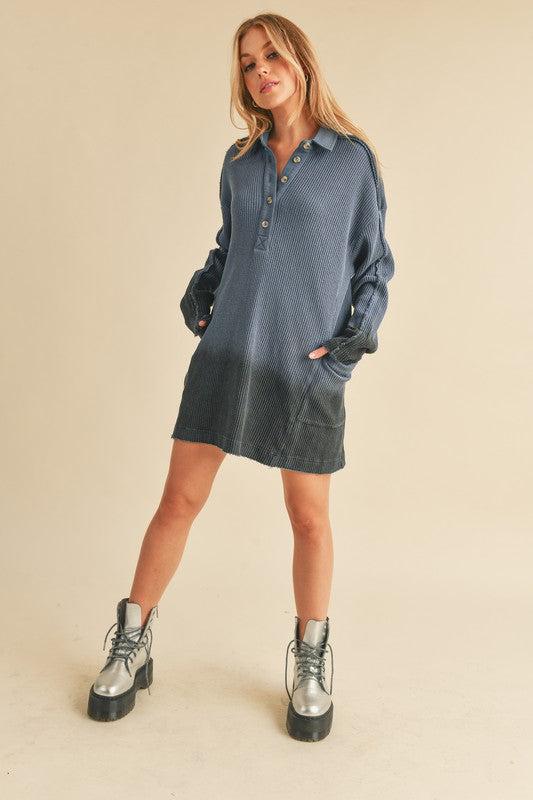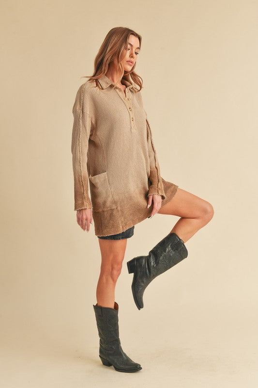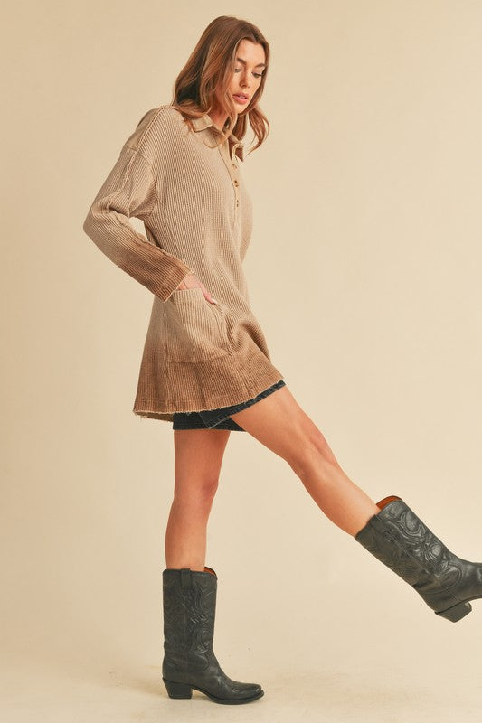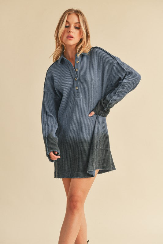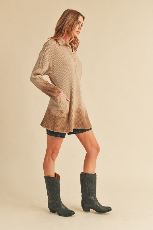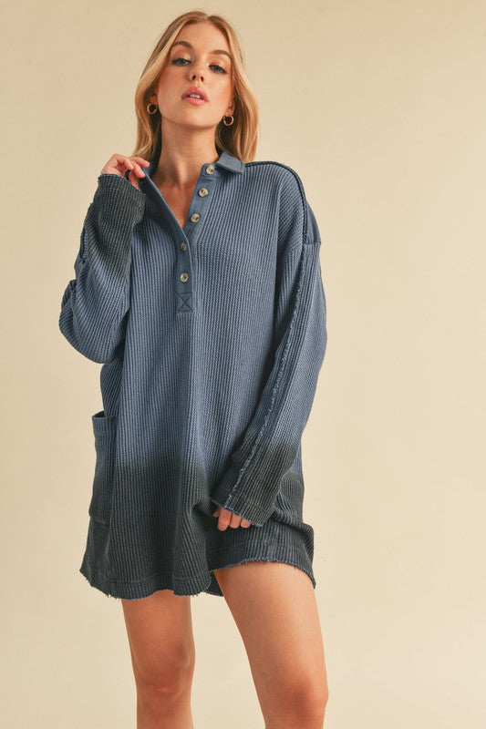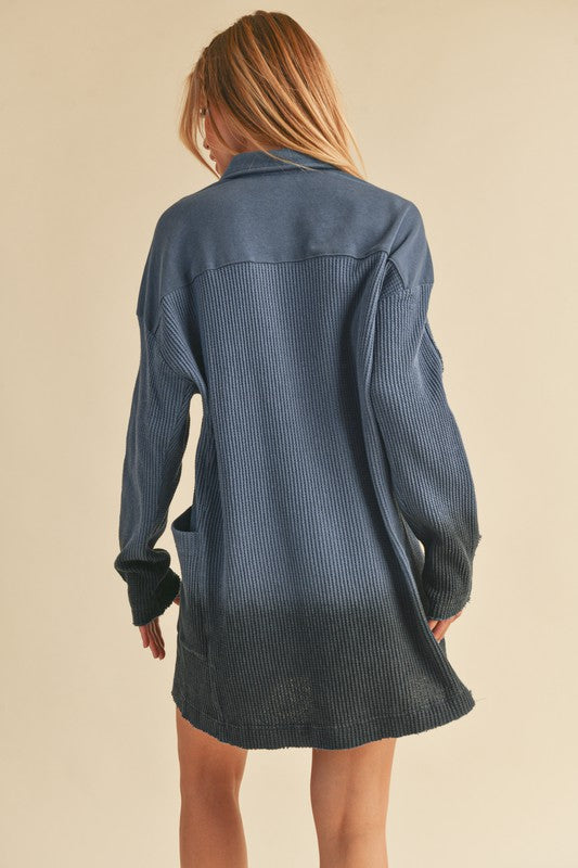 Unleash effortless edge with our so cool Capri thermal top. Embrace the oversized, slouchy fit and staple waffle knit fabric with contrast piecing at the back and ombre detail at the bottom, adding a dynamic touch to your outfit. The slouchy, longline fit complements the button-front neckline, dropped shoulders, classic collar, defined seaming, and side pockets. Elevate your style with this statement piece, designed to redefine casual chic.
