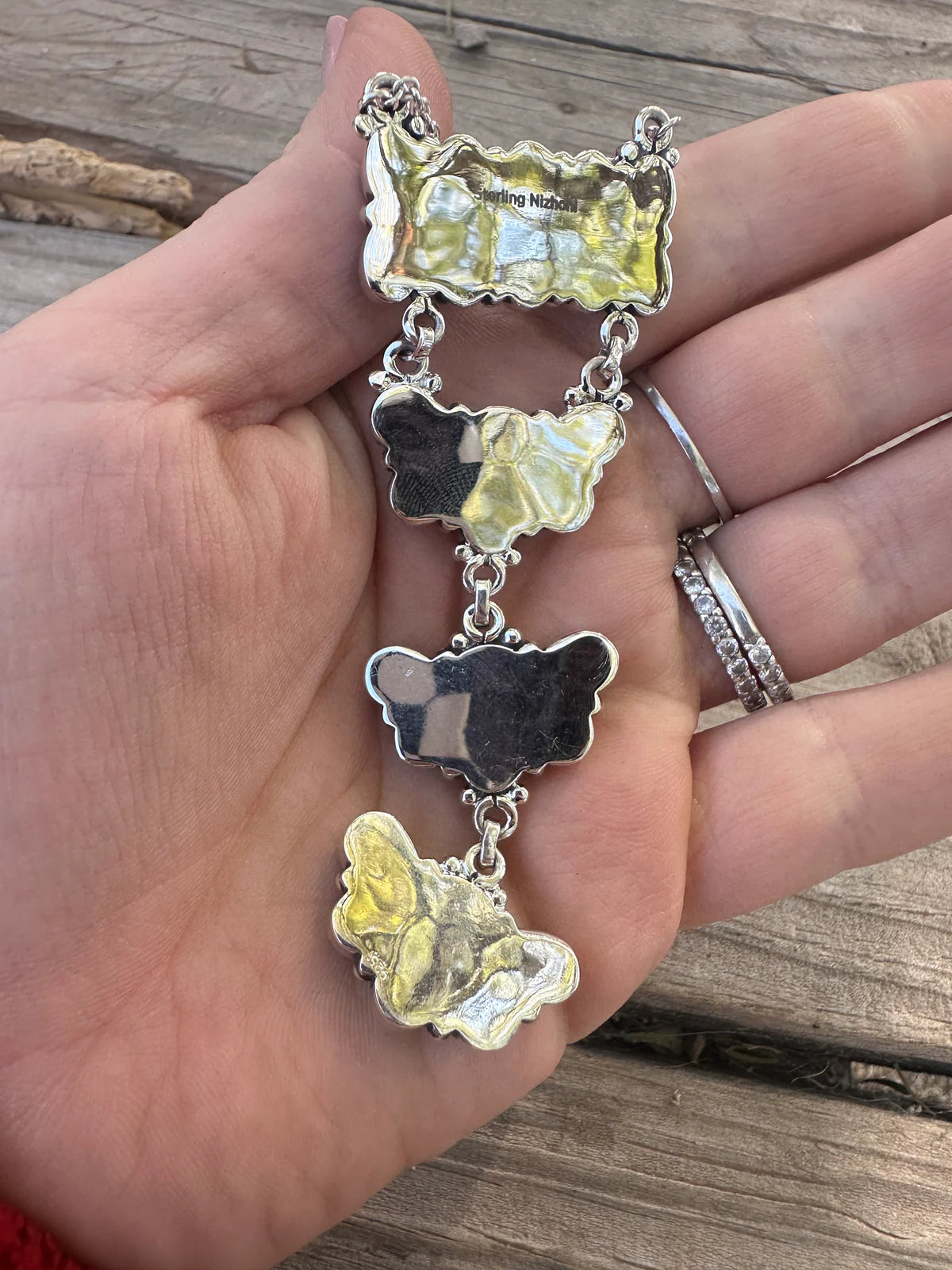 Such gorgeous craftsmanship! Necklace measures 17-19 inches long. Signed Nizhoni & Stamped Sterling. Pendant measuring an additional 3.5 inches long.