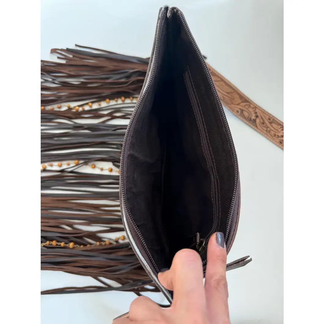Meet our newest crossbody - The Dixie Crossbody! 🩷🫶🏼 100% genuine leather 100% genuine cowhide beautiful hand tooled flower leather detail on front panel leather fringe Main compartment holds your keys, wallet, phone, makeup bag, etc. Zippered closure back of purse is all leather Inside: -zippered pocket strap is hand tooled leather and is 52” in length Strap is removable to use as a handbag/clutch 11 3/4 x 9" x 1” Strap is approximates 52" in length.