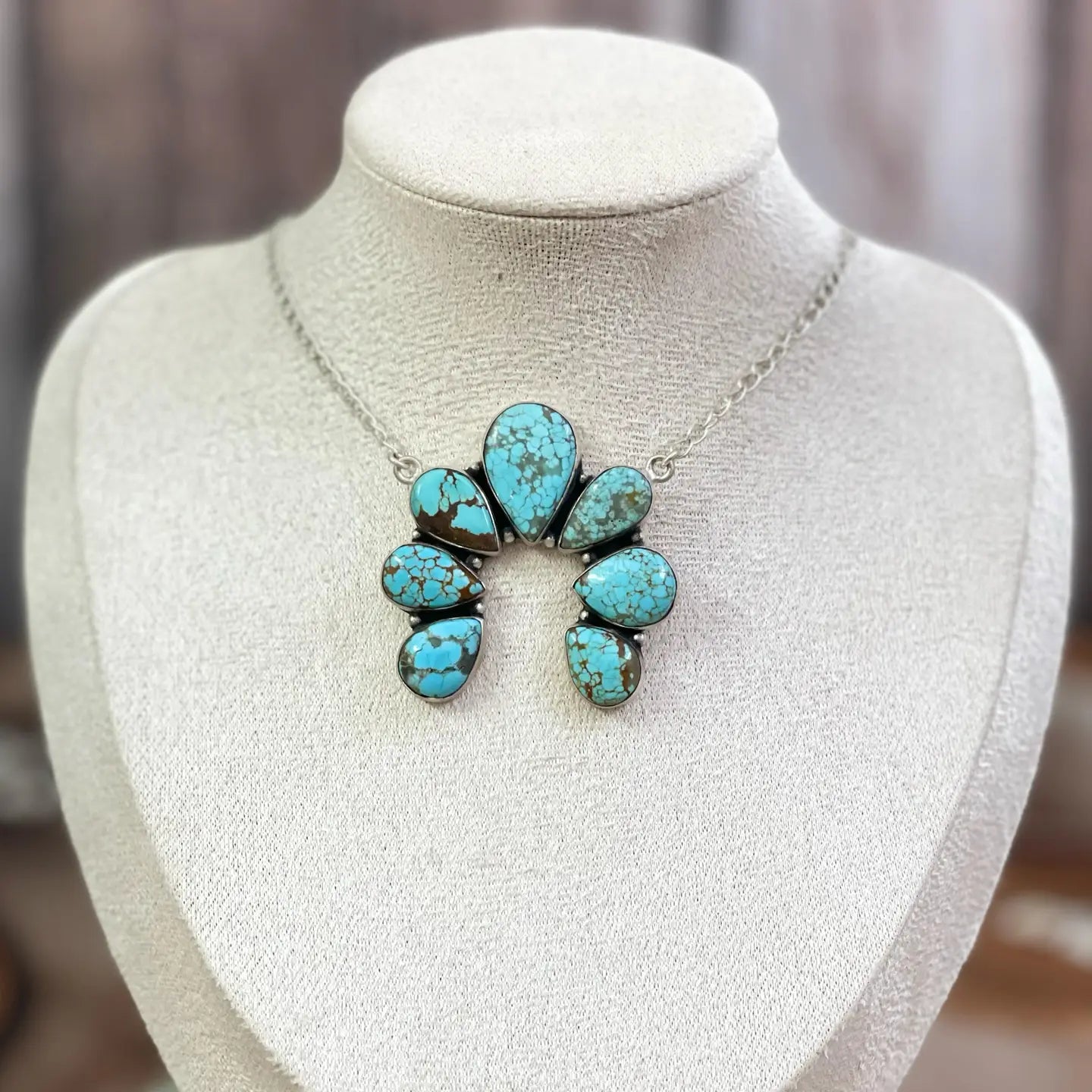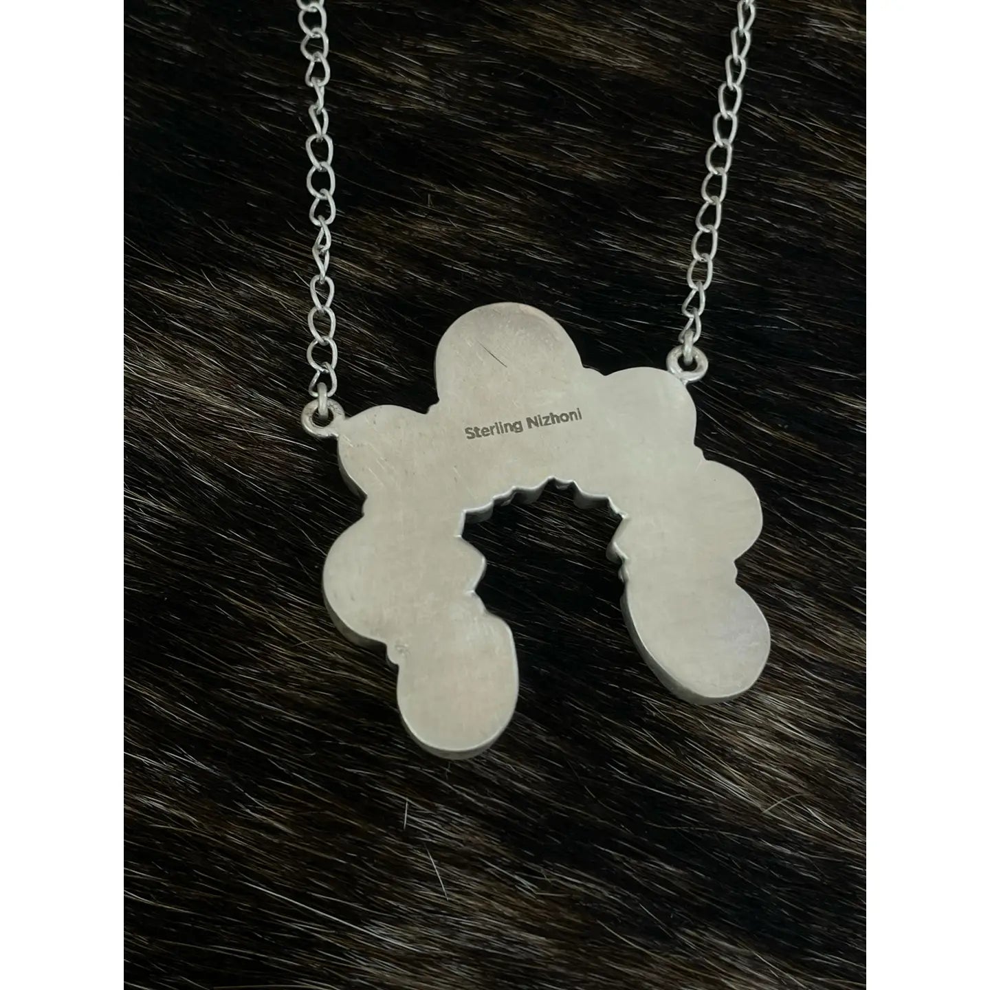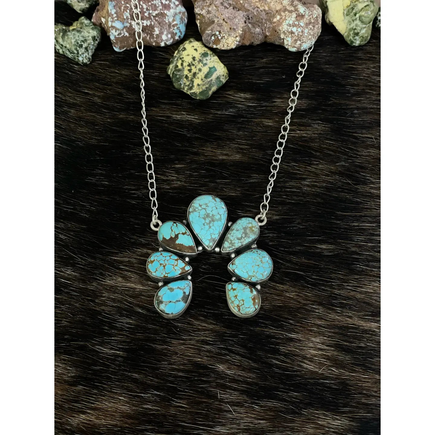 Type: Necklace * Main Stone: Number 8 Turquoise * Metal Purity: 925 Sterling Silver * Handmade: Yes * Brand: Nizhoni Traders LLC Beautiful Sterling Silver 20 Inch Necklace with Number 8 Turquoise stone. Such gorgeous craftsmanship! Sterling chain measures 20-21 inches long and width 1 3/8-2 inches. Stamped with “Sterling” and signed by Nizhoni. This piece is Non-Native.