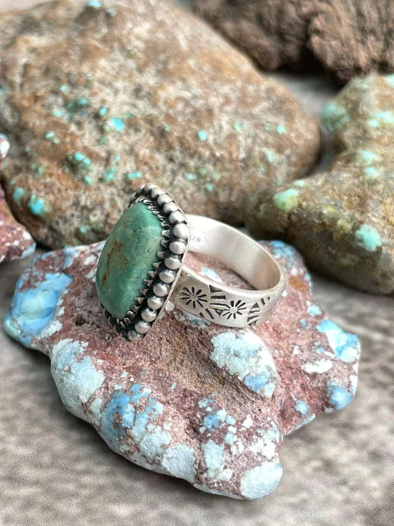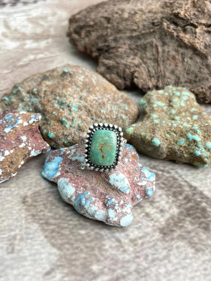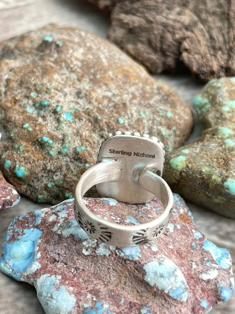 Introducing our latest masterpiece! This stunning Sterling Silver Old Stock Royston Turquoise adjustable ring is a true showstopper. With dimensions of 7/8" in length and 6/8" in width, it’s designed to make a bold statement.