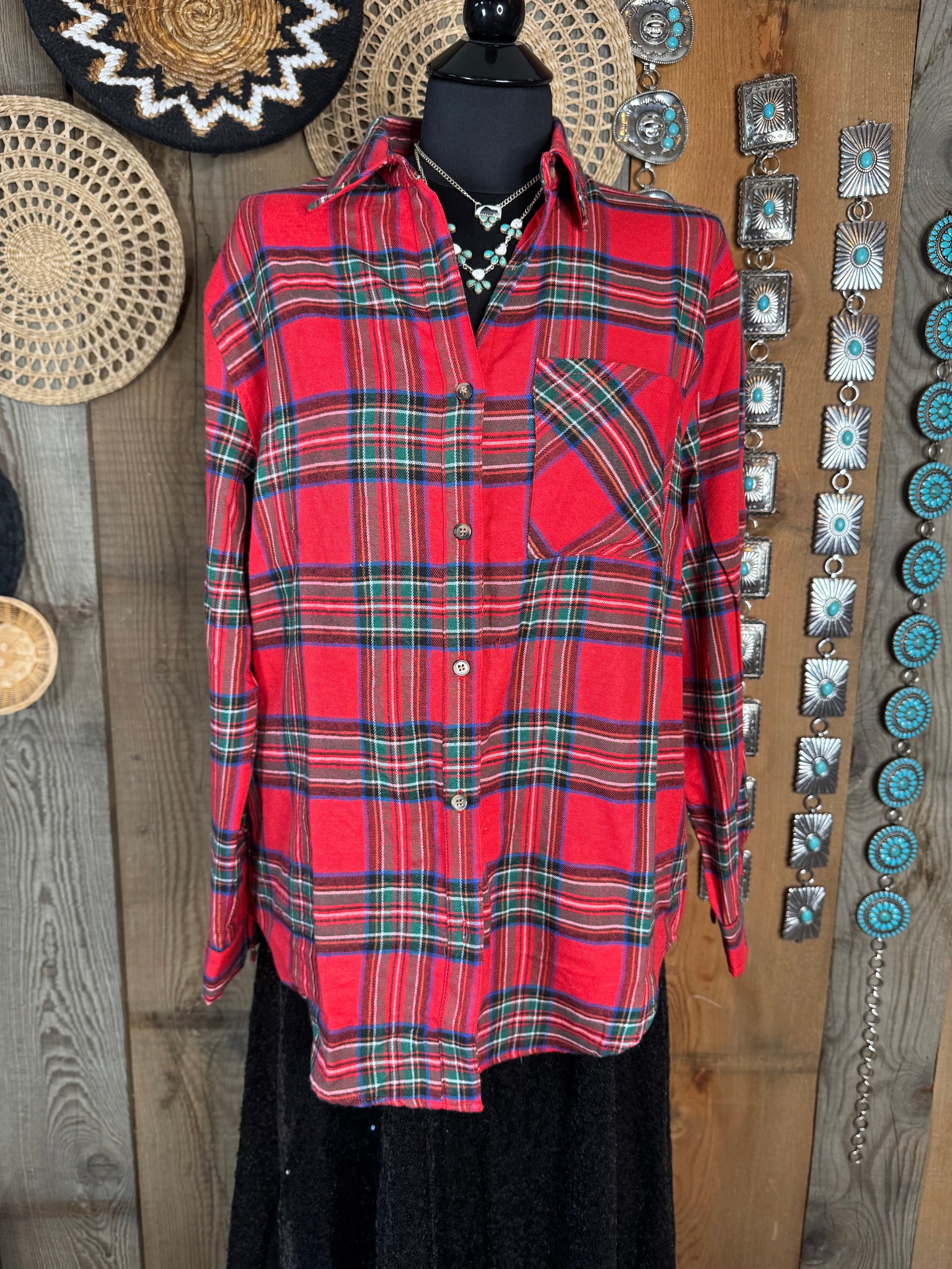 Classic button down top Plaid print and loose fit Chest pocket Collared neckline Model is wearing a size small Stretch, non-sheer Featuring Timeless plaid print adds a classic touch to any outfit. Loose fit design ensures a relaxed and comfortable feel. Effortlessly enhances your look with a cool, edgy vibe. The following measurements were taken from one side. Small: Shoulder: 18", Bust: 22", Waist: 22", Length: 31", Sleeve Length: 24.5" Medium: Shoulder: 18.5", Bust: 22.5", Waist: 22.5", Length: 31.5", Sleeve Length: 25" Large: Shoulder: 19", Bust: 23", Waist: 23", Length: 32", Sleeve Length: 25.5"