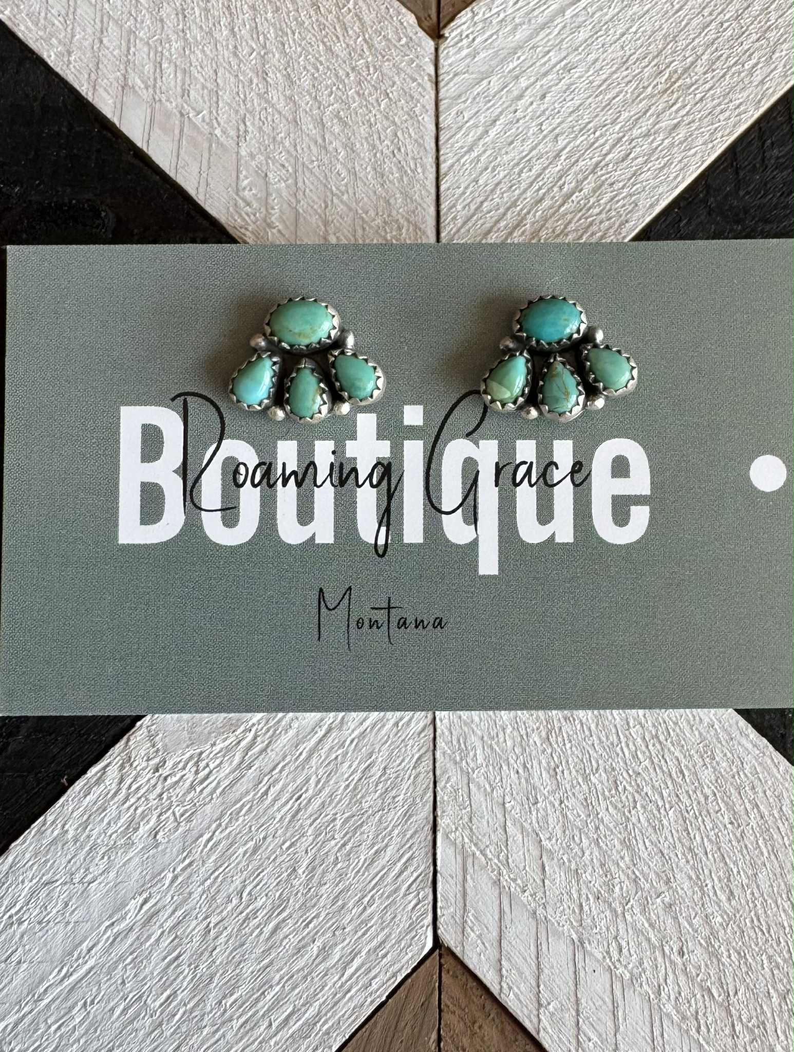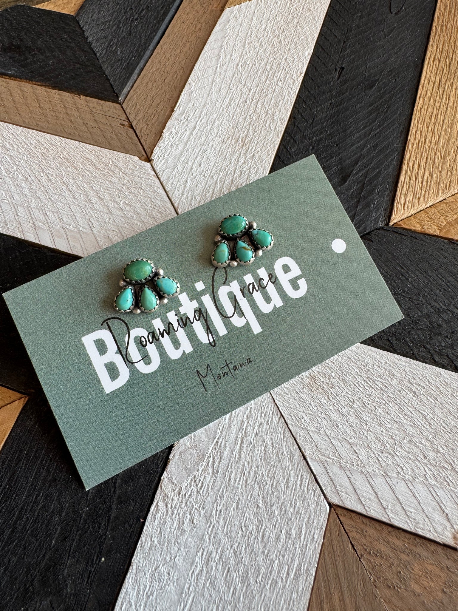 New without tags * JEWELRY TYPE : Earrings * TYPE : Cluster earrings * METAL : Sterling Silver * MAIN STONE : Turquoise “The Backroad” MINIS Elegant Handmade Sterling Silver Turquoise 4 Stone Post Earrings. Measuring 1/2 inch long and 3/4 inch wide. Signed Nizhoni and stamped Sterling. There are several pairs available and they will vary in color. ** Non Native**