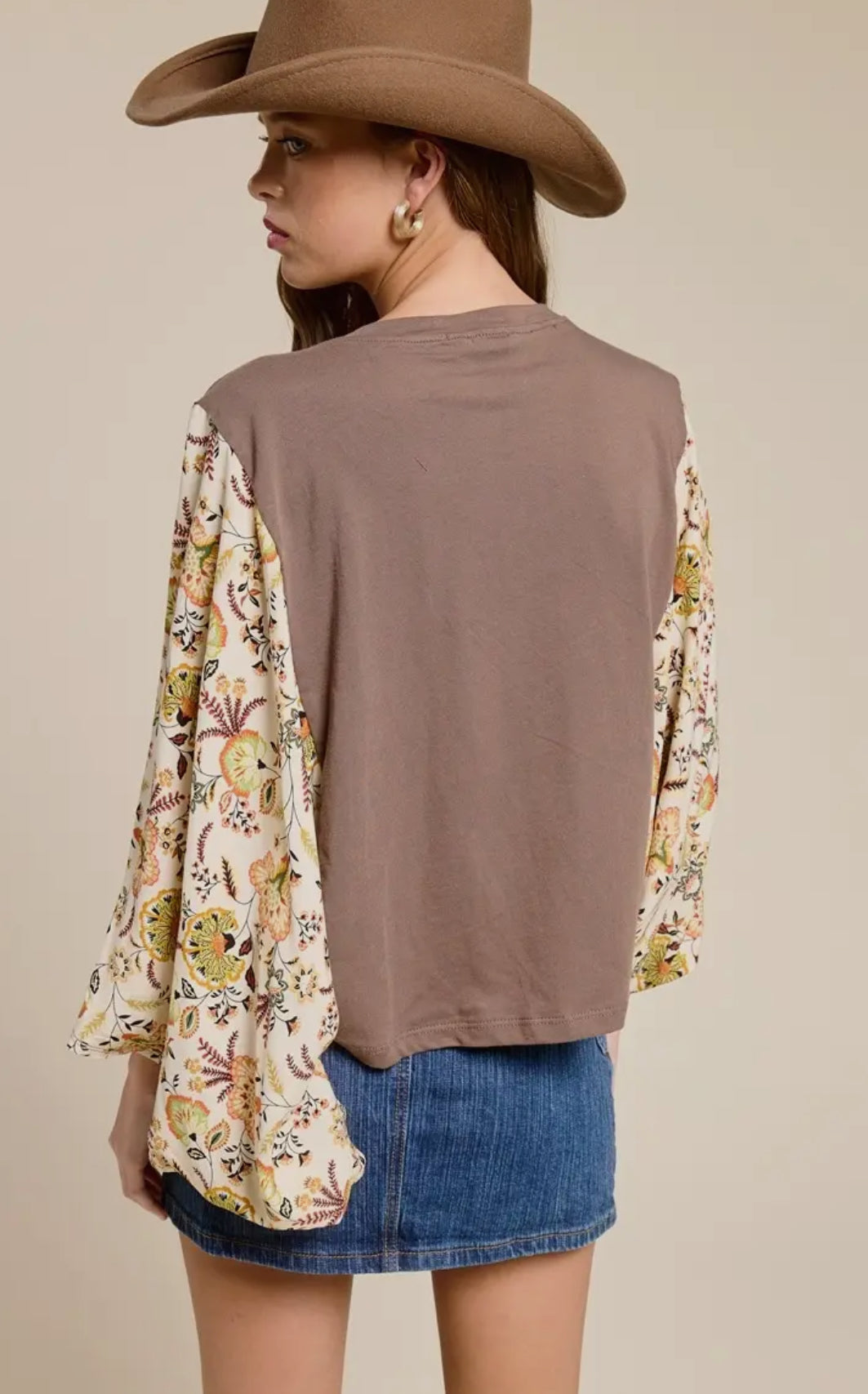 Puff' twin horse cowboy stitch graphic, rustic kantha top featuring lightweight, breathable fabric and flowy contrast sleeves
