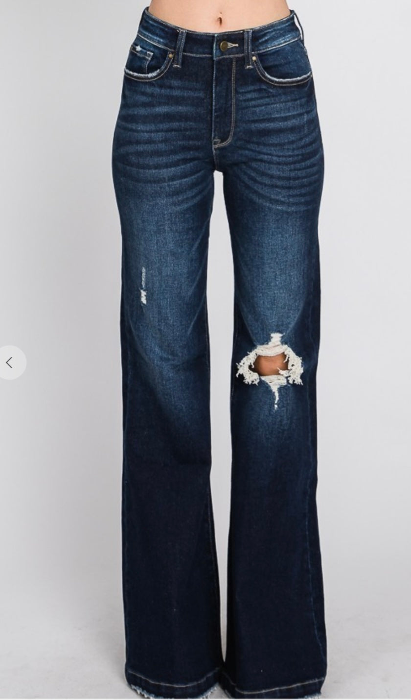 DESTROYED SUPER HIGH RISE 70s INSPIRED SUPER FLARE JEANS - 10.75" Rise, 34" Inseam, Modeled in size 3/25 - Super high-rise, '70s-inspired flare - Leg opening : 26" - Knee distressed - Heavy grinding hem - Button closure and zip fly - 5-pocket styling