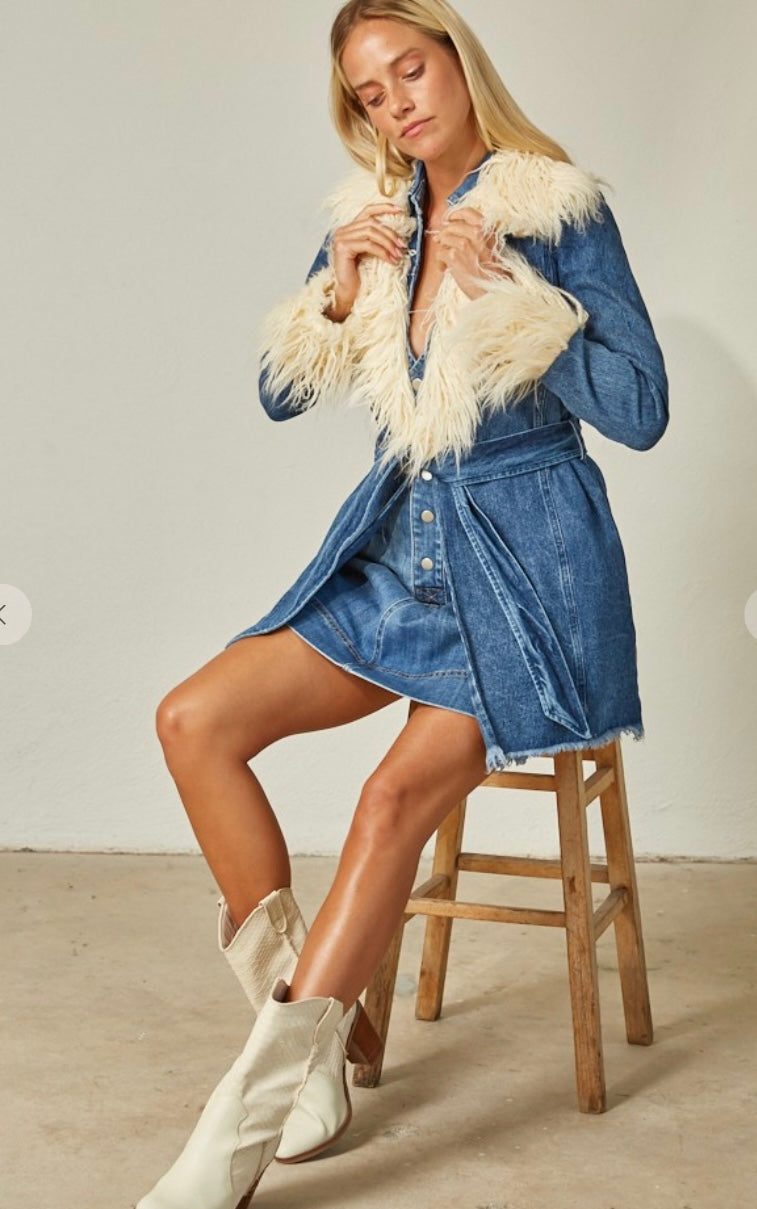 #WESTERN, TRENDY DENIM COAT, FUR TRIM COAT, BELTED DENIM COAT, VINTAGE JACKET, PENNY LANE COAT