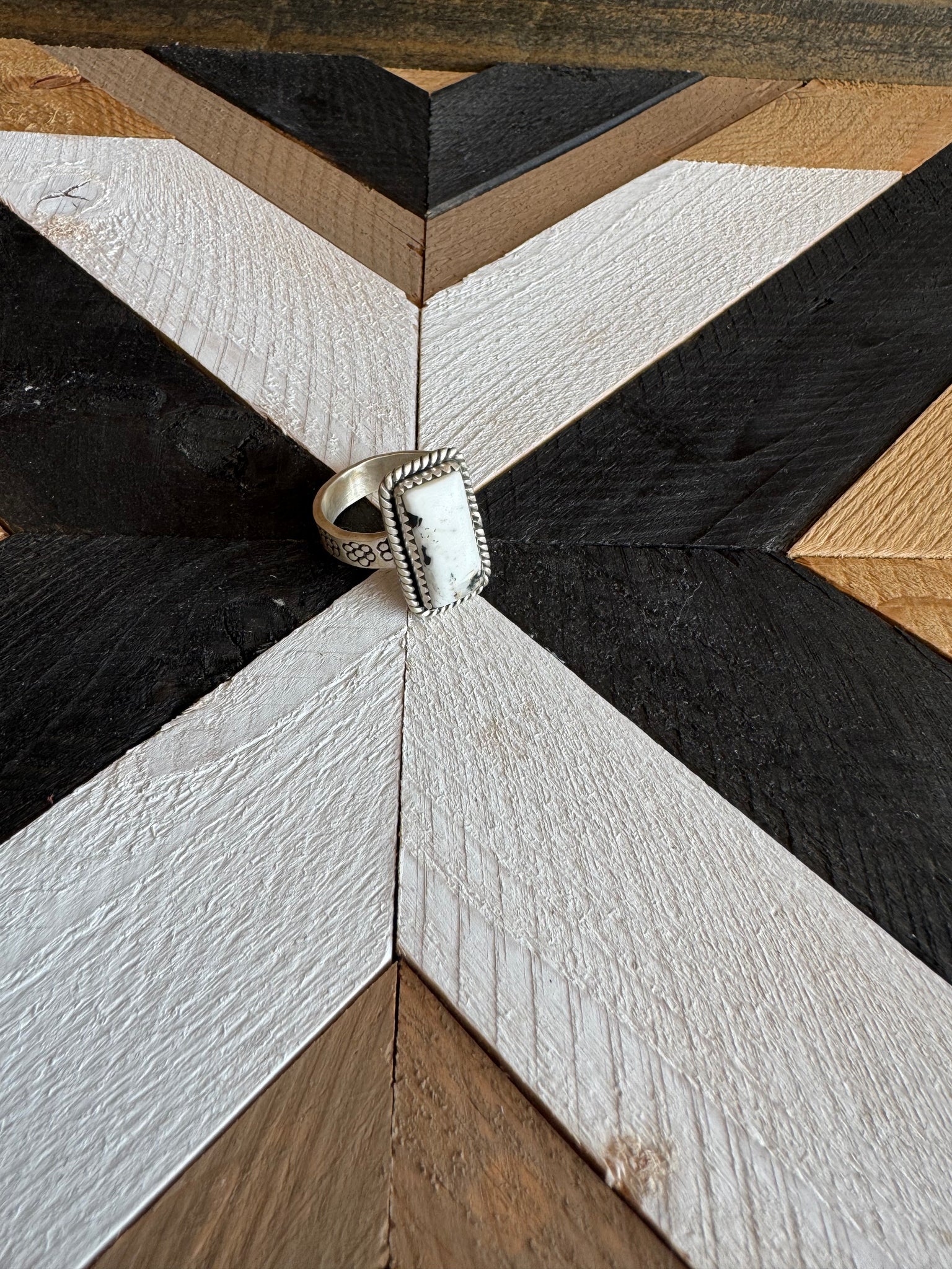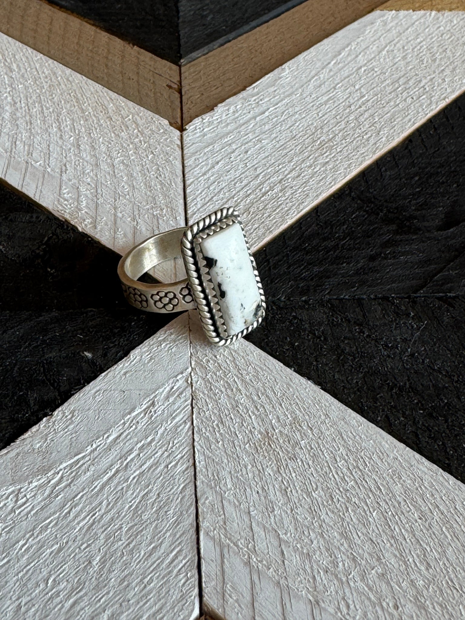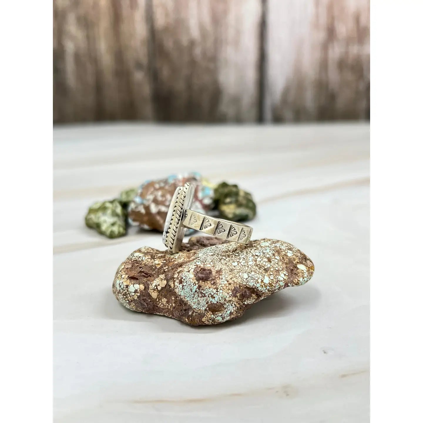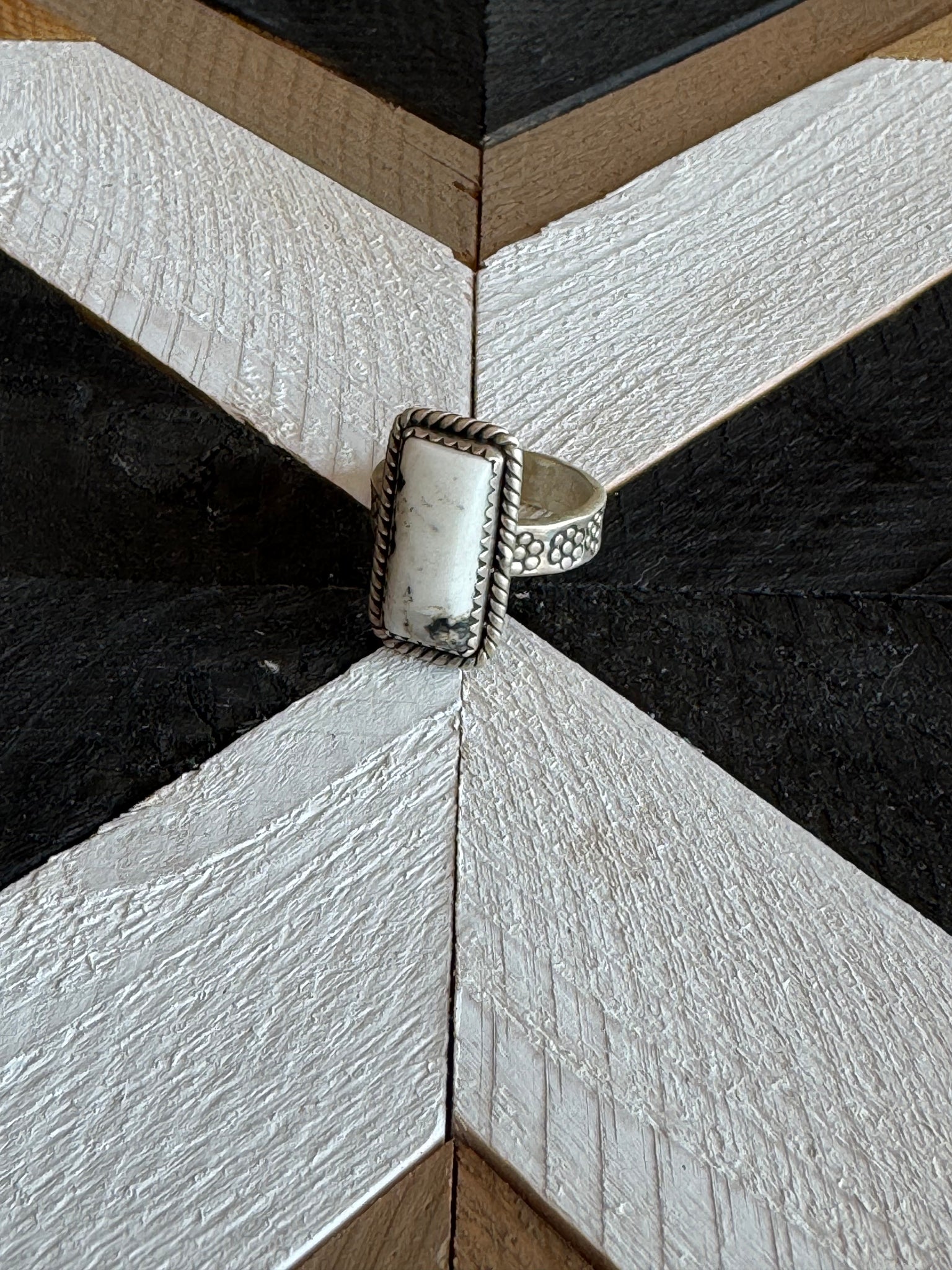 Product Details: * Category: Ring * Main Stone: White Buffalo Turquoise * Handmade: Yes * Metal Purity: 925 Sterling Silver * Brand: Nizhoni Traders LLC * Each listing is for 1 ring only. Introducing our latest masterpiece! This stunning Sterling Silver White Buffalo Turquoise adjustable ring is a true showstopper. With dimensions of 7/8 inch in length and 4/8 inch in width. Stamped with “Sterling” and signed by Nizhoni. This piece is Non-Native.