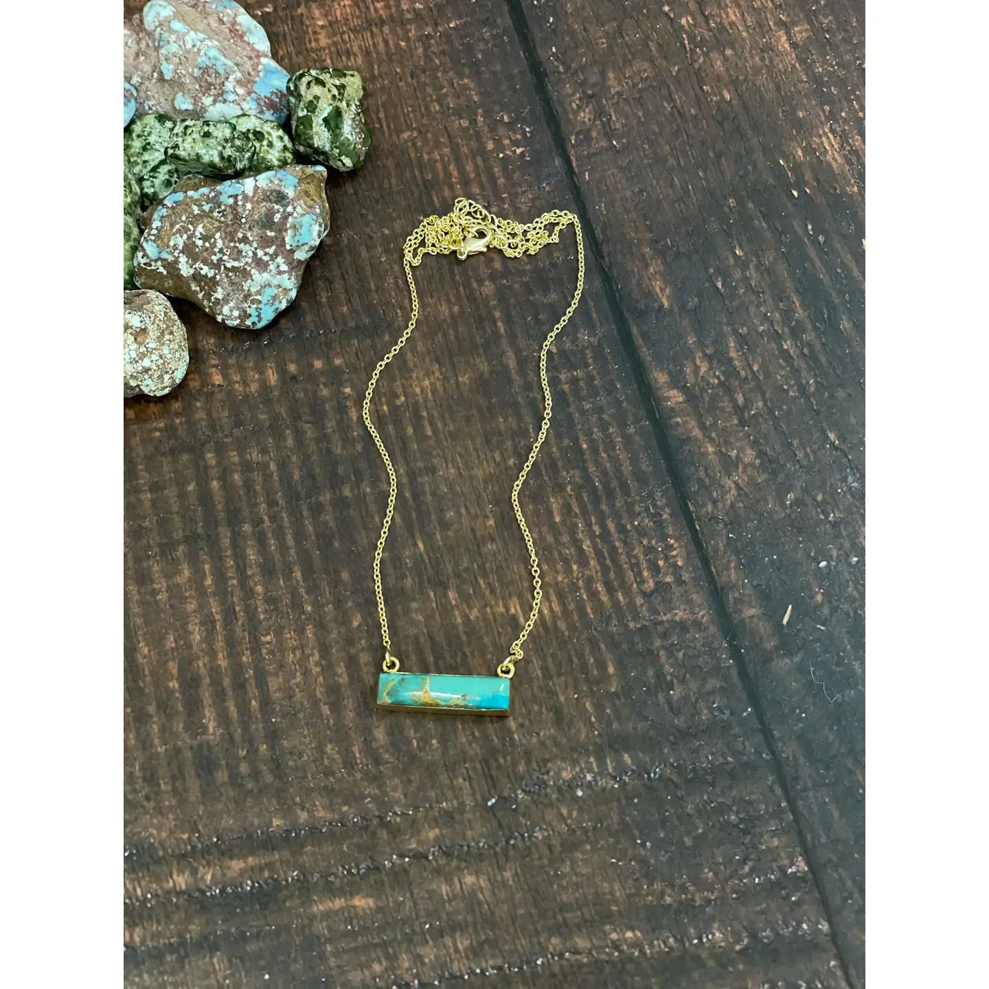 Product Description: * Category: Necklace * Stone: Kingman Turquoise * Material: Gold Plated * Handmade: Yes * *THE GOLDEN COLLECTION** Handmade Natural Kingman Turquoise Gold Plated Necklace.