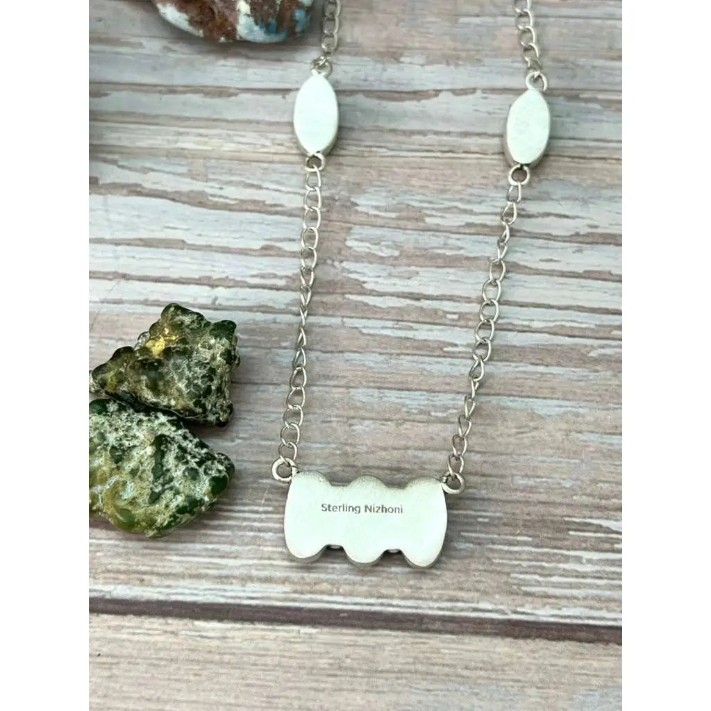 Product Description: * Category: Necklace * Main Stone: Kingman Turquoise * Metal Purity: 925 Sterling Silver * Handmade: Yes * Brand: Nizhoni Traders LLC * Each Listing is for 1 Necklace Such gorgeous craftsmanship! Sterling Silver Kingman Turquoise Necklace Measures Length 16+3" Extension, Width 1".